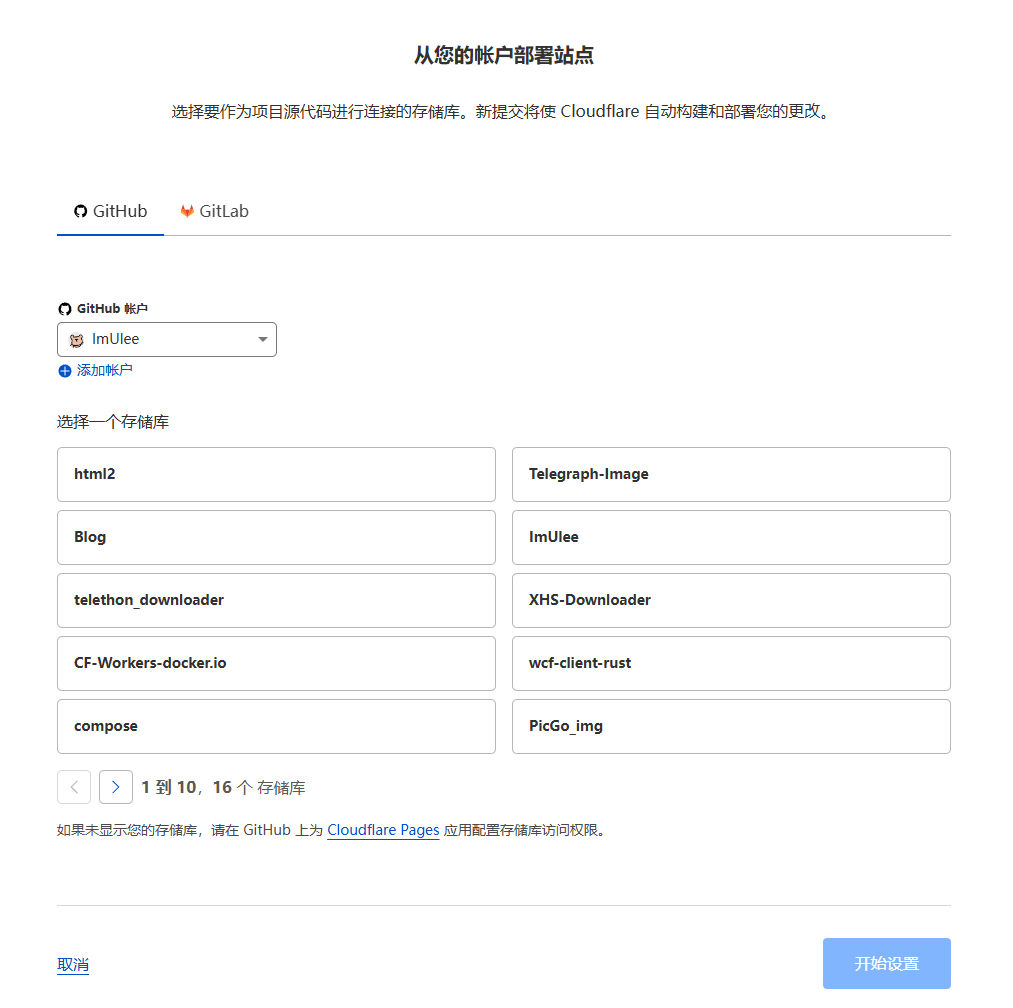 添加你的 Github 账户后选择刚刚 Fork 到库里的 Telegraph-Image > 开始设置,跳转按照页面提示输入项目名称后点击保存并部署