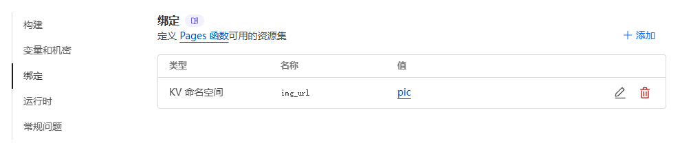 再回到 设置 > 绑定 > 添加 > KV命名空间:变量名称:img_url KV命名空间:pic